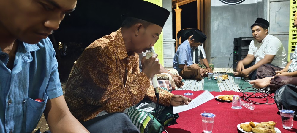 Sumber Foto : KIM SUMBERSARI-Ky Seniman saat lantunkan surah suci Al-quraan di acara pengajian anjang sana. Senin (20/04/2026).